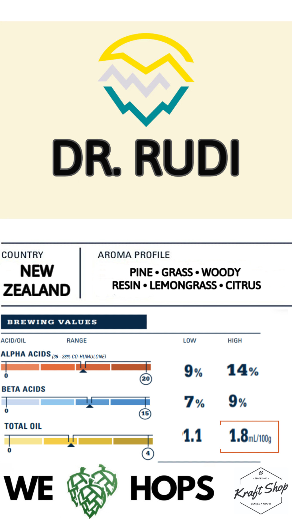 A Dr. Rudi egy nagyon izgalmas Új- Zélandi komló. Dr. Rudi egy triploid, amit Smoothcone keresztezéséből származik. 1976-ban vezették be, azonban a hivatalos neve 2012-ben változott Dr. Rudira. A Dr. Rudi komló egy igazi ízbomba, ami nem a klasszikus vonalat képviseli. Aromáiban megtalálható a gyantás, fenyős, fás, citrus, citromfű, lime. Tökéletes választás szinte bármilyen sör készítéséhez. Kifejezetten ajánljuk, a használatát aroma, whirpool/hopstand és hidegkomlóként! NEIPA-hoz és IPA-hoz, WC IPA-hoz az egyik legjobb választás.